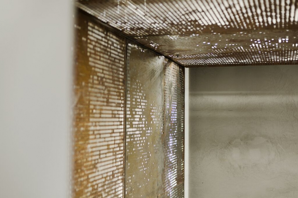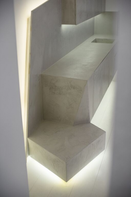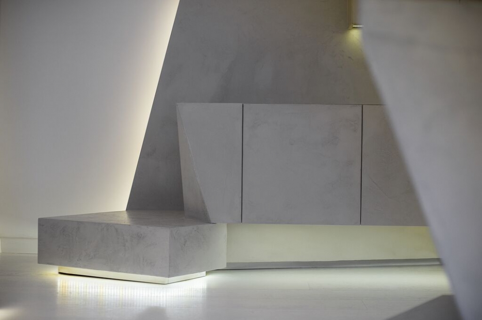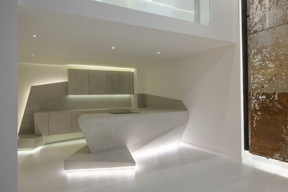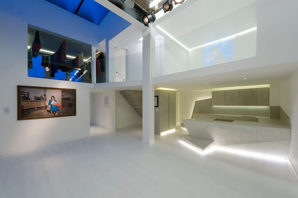 The stark white interior of the central room is contrasted by a metal wall piece, delicately backlit by LED lights, all adding to the ambiance of creative mystery.
