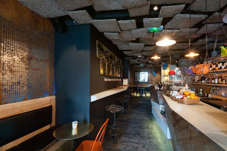 The chaotic cut out ceiling hangs above, adding to the unique character, while cleverly placed lighting brightens all the right corners with a becoming luminosity.