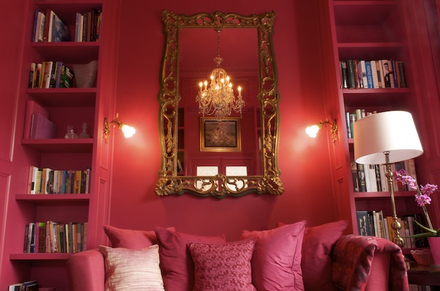 The use of such extreme contrast of colour debunks the myth that bold colours make rooms feel small. In fact, quite the contrary - by not breaking the lines with a white ceiling, or window frames, the single colour deepens the mood and evokes a lively sensation.