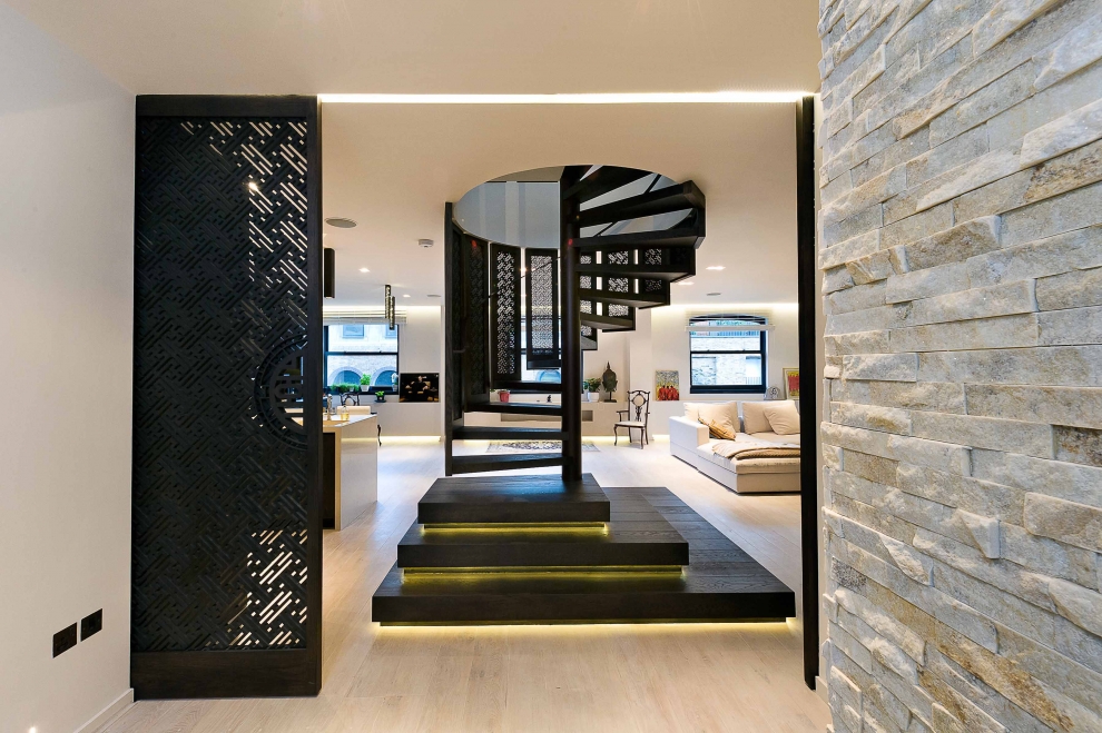 Pivotal to setting the tone and theme of the penthouse, and the first thing to greet the entrance - is the sculptural staircase wrapped in dark lacquered wood. Inspired by the ancient Chinese Coromandel Screens, oak patterned panels encompass the bespoke created and lit-up steps, to create an eye-catching feature centre piece to this luscious London penthouse.