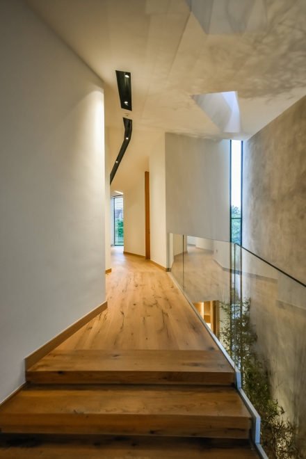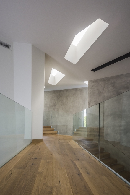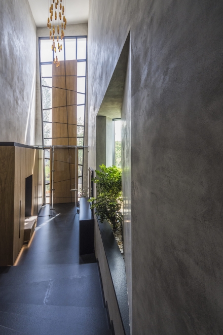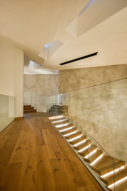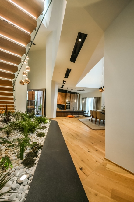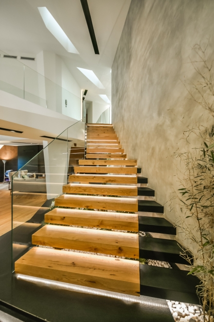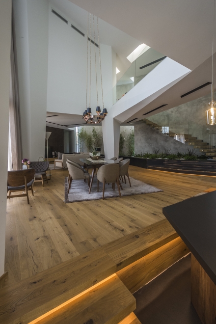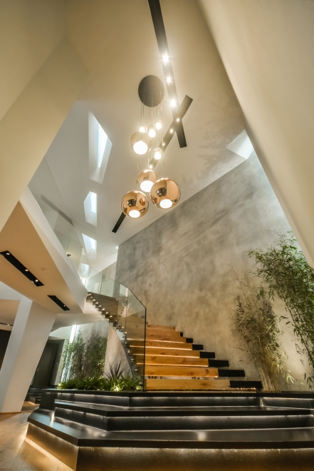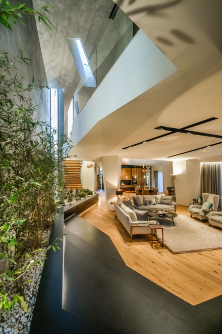 With orientation and natural illumination meticulously planned, large south- and west-facing windows provide atmospheric corners and astonishing focal points that draw the eyes into specific areas during any time of day. The intersection of planes, walkways and stairs encourage social encounters and visual exploration within a sprawling space of 850 sq.m. Areas dissolve into one another-- from the private outdoors of its gardens through to the surreal landscape within the contemporary mansion, the home’s interior becomes an extension of its exterior, connecting with nature to breathe in surrounding life.