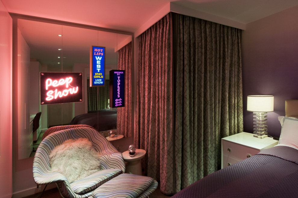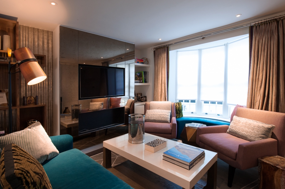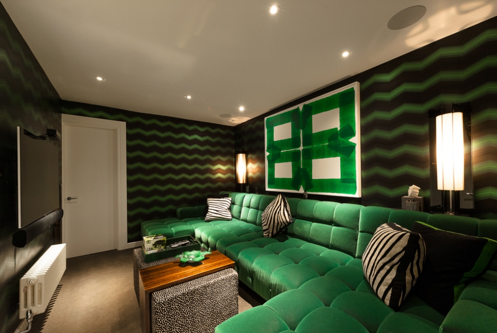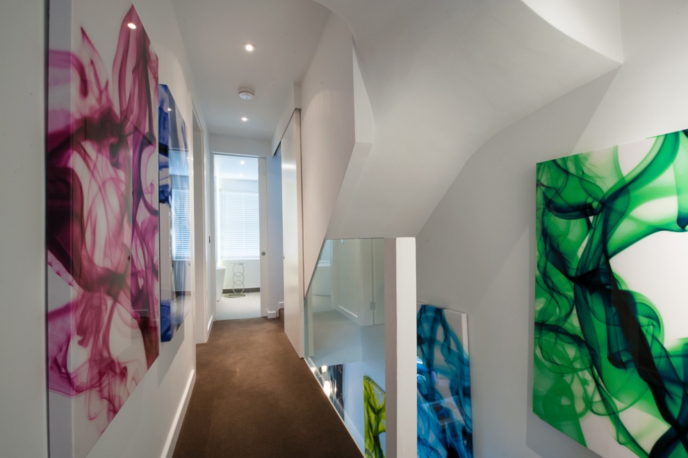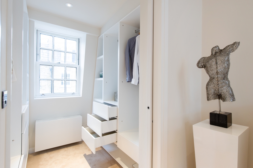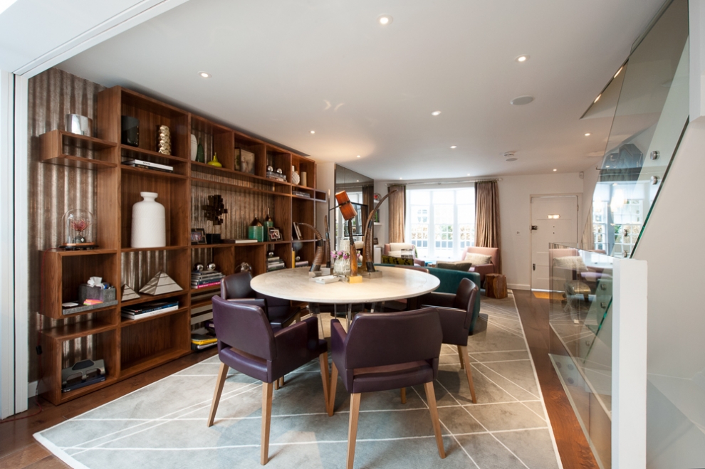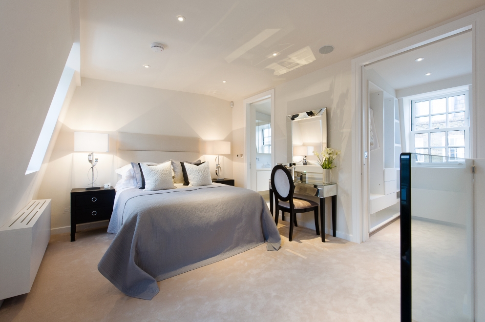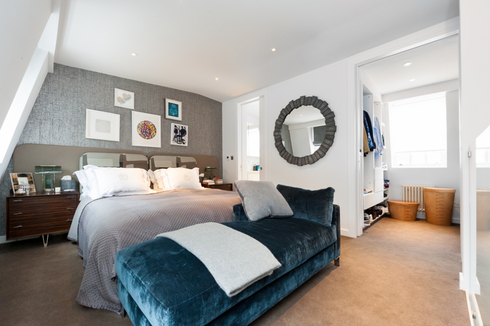 On the top level lies the master bedroom, restfully gleaning of cosy comfort – walnut wood and faux crocodile lining the bespoke walk-in-closet.