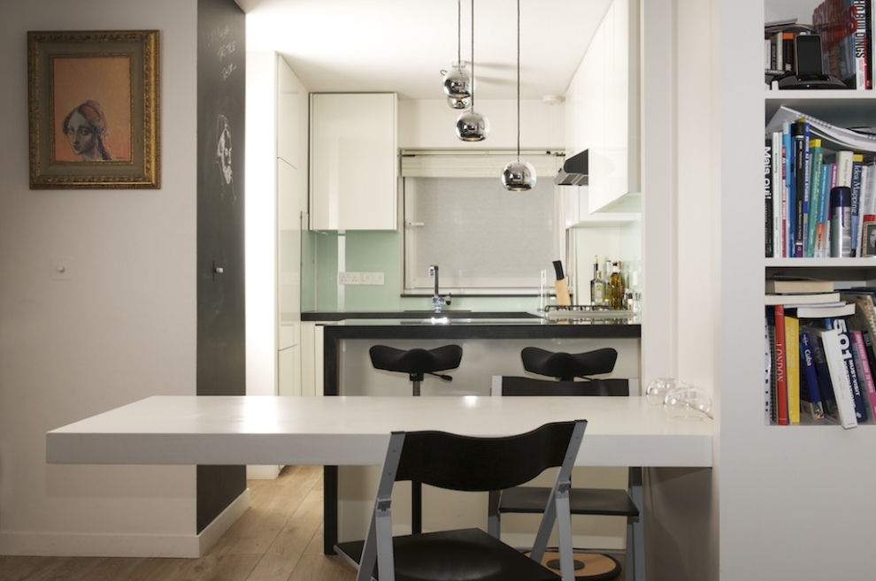 In the kitchen, cantilevers folds down to become a table for working, or dining –the disappearing illusion of a floating table - that doesn’t encroach on precious living space when not in use.