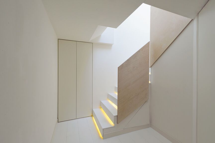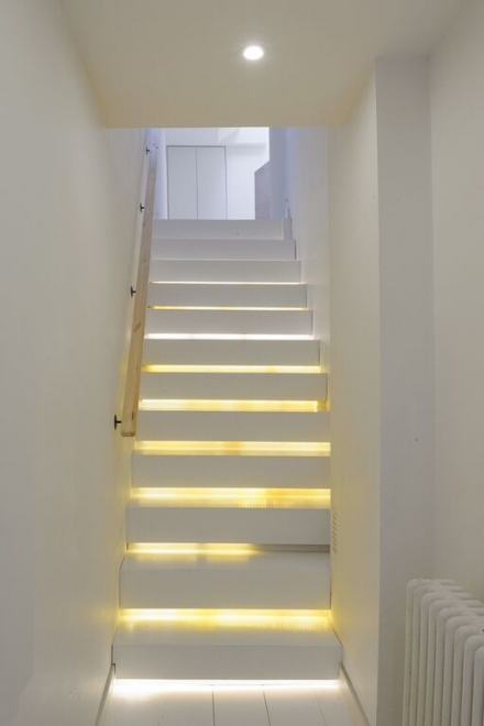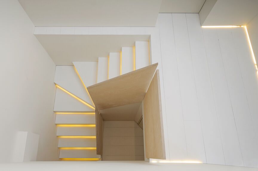 The long, masterfully lit stairway entreats you to a