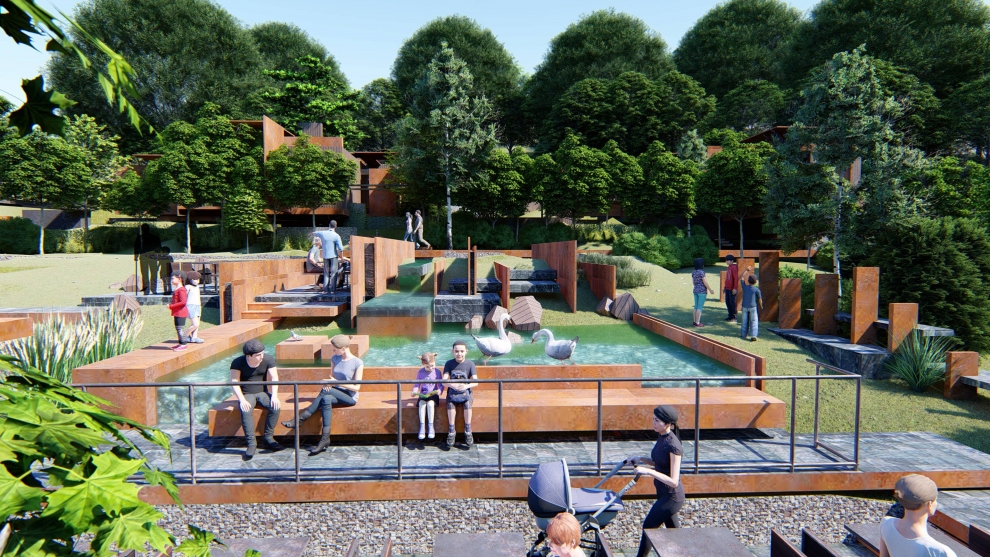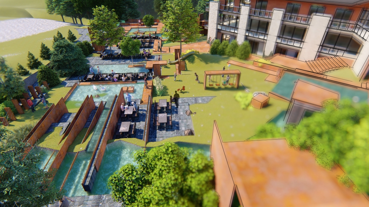 Gardens In the central area of the parcel, it is recommended to maintain a garden of local character, with natural water / greenery contents and sound terrace structures, cascades and sculptures that shape the residence area. The focus remains on a clear visual communication through space. As the joining and strengthening element of this place’s character, a water flaw will be used with waterfalls from the upper corner, along the children's playground, space with tables in the direction of its flaw from the riverbed. The children's play area has a wide reach, it also covers water surface and has visibility from the surroundings. Capacity of 69 tables / 284 seats.