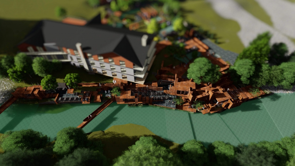 Riverside The area near the river is conceived as a composition of fragmented sculptural volumes. The volumes are created from tile elements and wooden beam / pillar, in combination with rustic metal and vertical and horizontal glass panels, to allow contact with the surrounding environment, and not just the river side. This composition will encourage sitting on the other side of the terrace as well. The composition also encourages use in wider areas for larger groups of guests. Capacity of 72 tables / 362 seats.