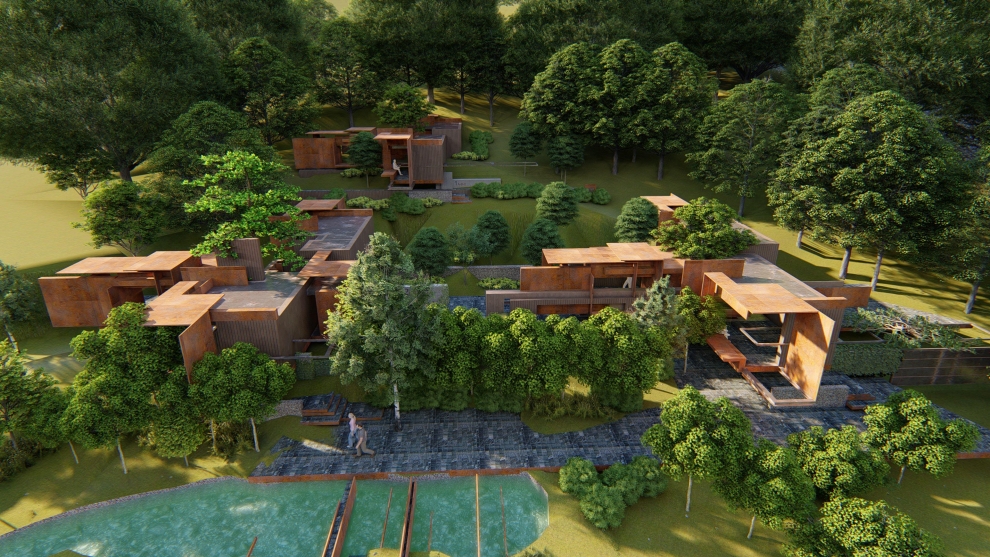 Lodges Utilization of the terrain configuration and garage contents of that area, on which there can be construction, but always creating topography and an environment similar to that of the surroundings. The lodges are arranged in small groups, offering compactness on one side and privacy on the other. The views from the lodge are oriented towards the natural environment, removing visual communication with the main hotel building. Capacity of 9-12 one/two room units. |