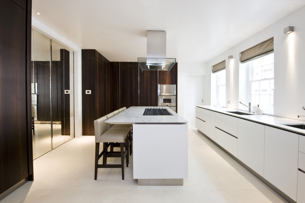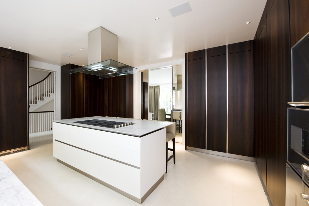 The interior design and materials used were a mixture of both 4M bespoke and manufactured. In the kitchen, whist the floor marvelled with immaculate French white limestone – the doors and joinery elements were all designed and created especially to fit the house. Similarly, on the master bedroom level, the bath was created using book matched Calcutta stone which was selected on the quarry.