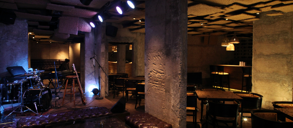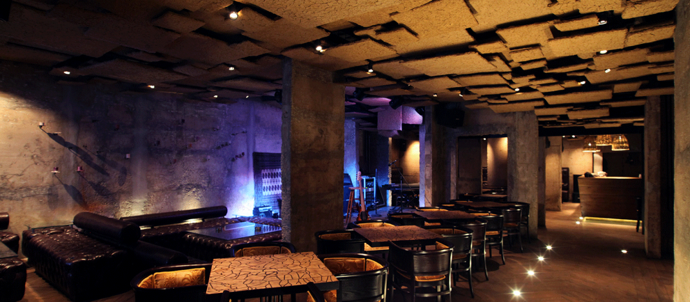 A collective memory of eight months of labour is engraved into the walls of the 3000 sq. ft. lounge, as the carvings of the workers' hammers, and tools are permanently imprinted into the concrete. The client's main concern was not an aesthetic issue, but an acoustic one. How to enhance sound quality without disturbing residential neighbours within a confined concrete basement?