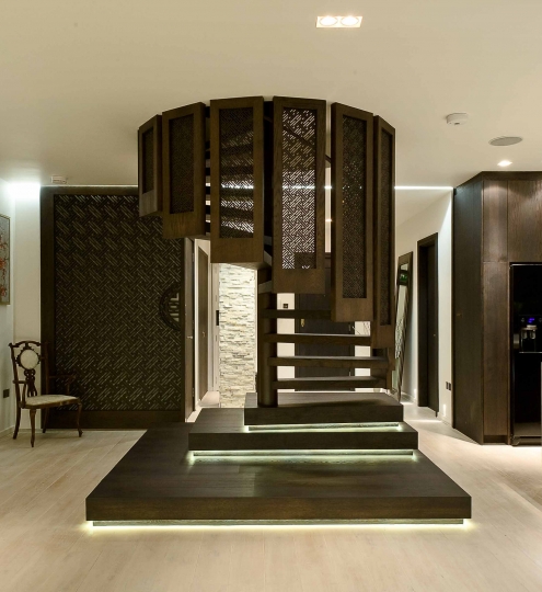 Pivotal to setting the tone and theme of the penthouse, and the first thing to greet the entrance - is the sculptural staircase wrapped in dark lacquered wood. Inspired by the ancient Chinese Coromandel Screens, oak patterned panels encompass the bespoke created and lit-up steps, to create an eye-catching feature centre piece to this luscious London penthouse.