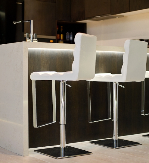 In the master-bedroom cut out ceiling windows and a glowing border lights, frames the room in a way that creates an atmosphere of intimacy and relaxation. A velvet cushioned wall acts as a partition, to hide the bed from the rest of the room, allowing ample space for entry to the custom made wardrobe behind, full of nifty gadget of organisational genius. Adjacent to the bedroom, the master en suite bathroom is dressed with Crema Marfil marble, which is accentuated with atmospheric lighting that would rival the stature of any five-star luxury spa-room.